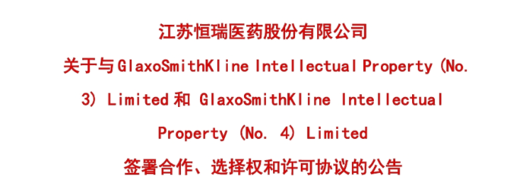 (1)根据协议,恒瑞医药将自主研发的PDE3/4抑制剂创新药HRS-9821在除中国大陆、香港特别行政区、澳门特别行政区及台湾地区以外的全球独家权利有偿许可给GSK。确定性。https://mp.weixin.qq.com/s/19PDOAoShZu6cKmA30tDxw。